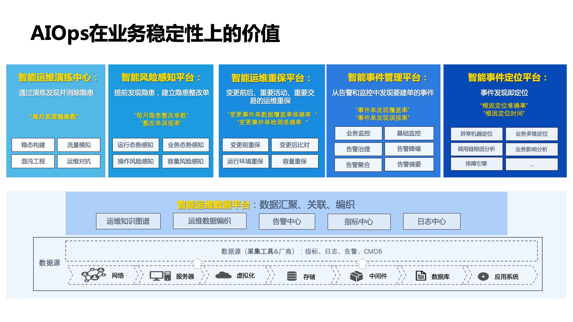智能运维系统在企业成熟落地时,价值和效果是衡量落地成功与否的标准。对于“利用AI技术解决运维问题”的智能运维领域,无论是价值实践,还是效果实现,毋庸置疑地指向了IT运维系统的稳定性上。而每个需求的平台针对其要实现的功能,都应有可量化度量的价值,并由此设定目标。